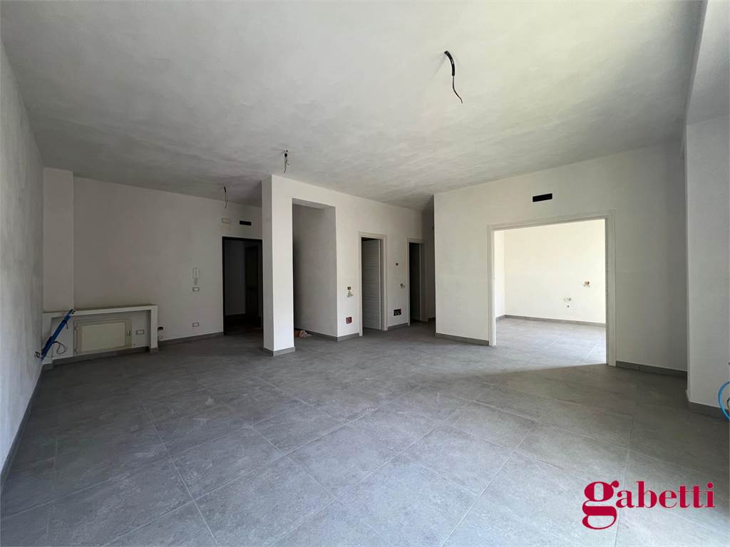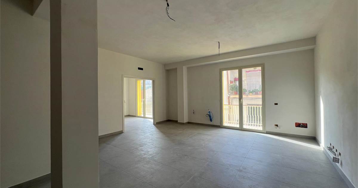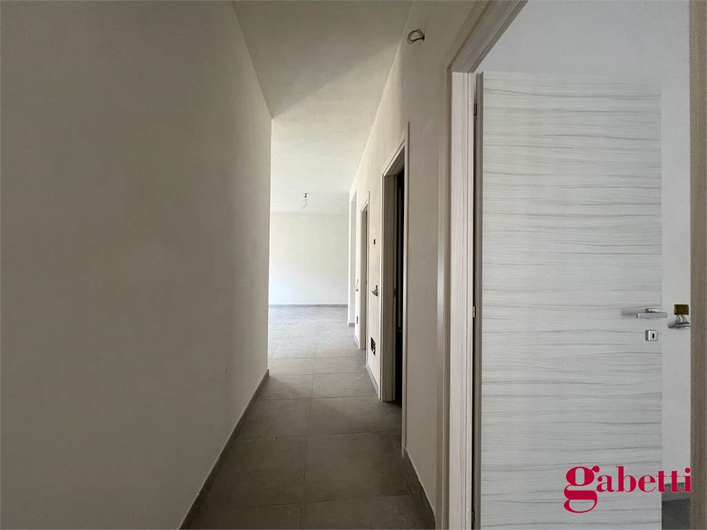La casa ha ingresso sull’ampio salone con porta finestra verso la balconata principale, cucina collegata in “openspace” con il salone e dotata di porta finestra verso il balcone comune, corridoio, primo ripostiglio interno, bagno principale con finestrella interna e doccia doppia, camera da letto con accesso al balcone comune, camera da letto matrimoniale con bagno in camera (dotato di doccia e finestrella interna) e balcone esclusivo, ripostiglio esterno sul pianerottolo.